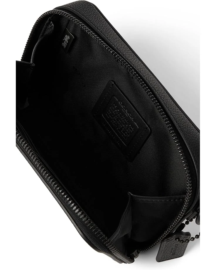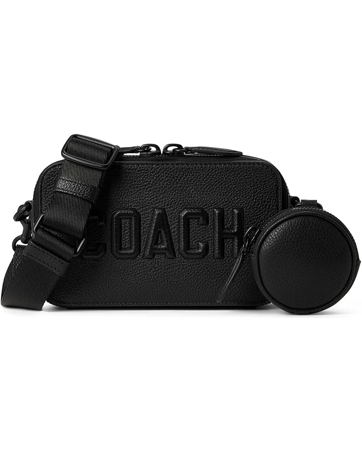 - The chic COACH™ Charter Slim Crossbody With Coach Graphic is perfect for carrying just the essentials in style. This comes with a removable round pouch and adjustable detachable strap for shoulder or crossbody wear. Crafted from polished pebble leather it is lined with polyester fabric. It has zippered closure with two compartments and hosts six credit card slots.