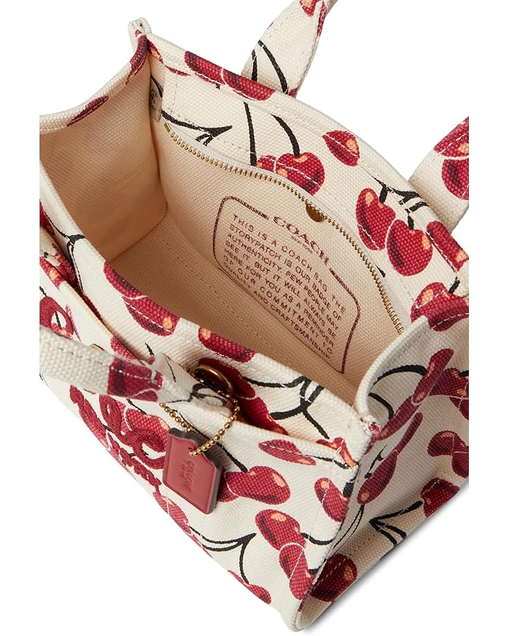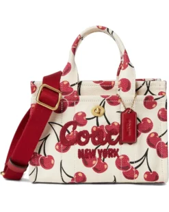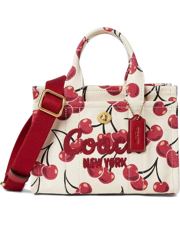 - Add a colorful touch of vibrancy to your look while carrying the COACH™ Cargo Tote Bag 20 with Cherry Print. This stylish bag comes with dual handles and a detachable strap, perfect for shoulder or crossbody use. Featuring an allover cherry print, the bag boasts a zip-top closure to keep your belongings secure, while the outside turnlock and snap pockets offer additional storage options.