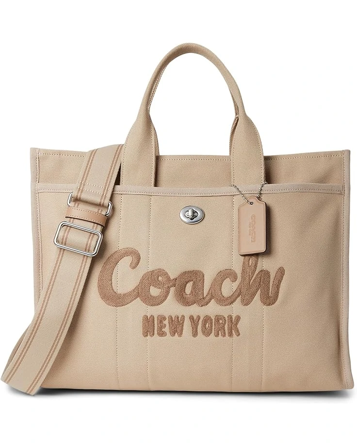 - Take your style statement to the next level and keep essentials stored carrying the COACHâ„¢ Cargo Tote Bag 42. Crafted with canvas material, the tote bag features two hand carry straps and a detachable strap for effortless shoulder or crossbody wear. the bag is also designed with a zip-top closure, outside turn-lock & snap pockets, and can easily fit a laptop. The signature branding on the front gives the bag a touch of authenticity.