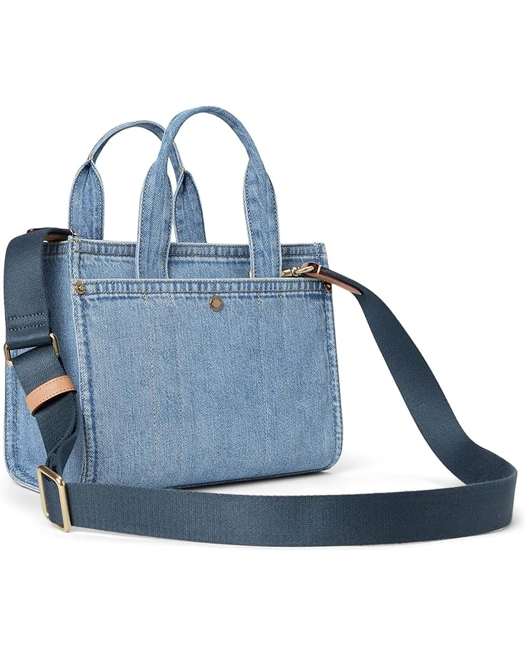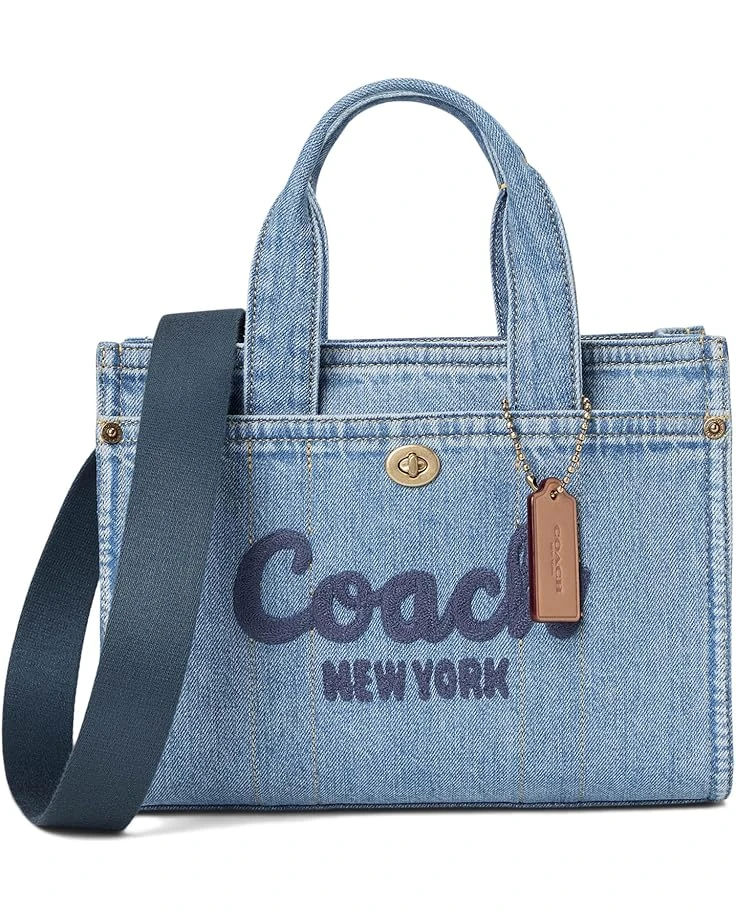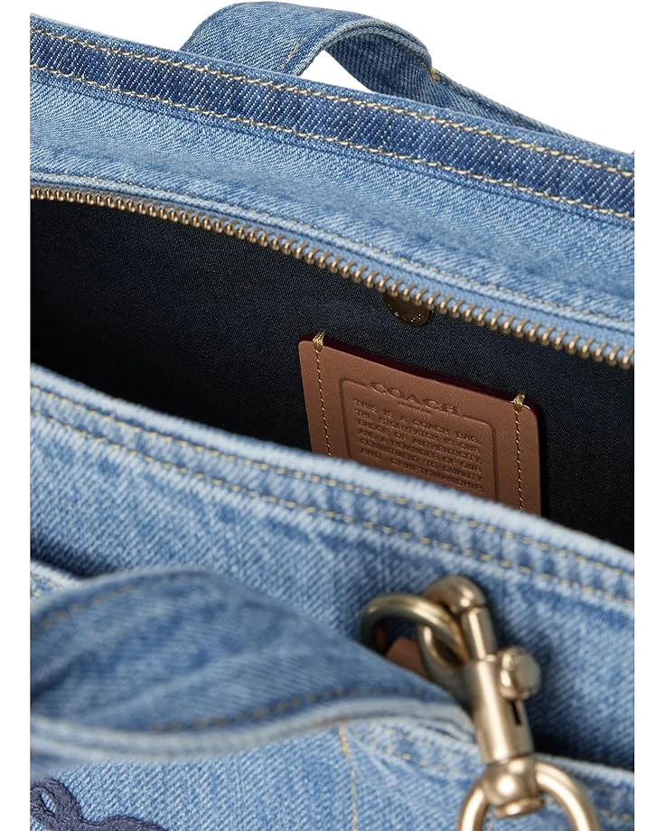 - Complete your stylish looks by carrying the COACH™ Denim Cargo Tote 26 Bag. Crafted with luxurious denim and vachetta leather, the tote bag features two top grab handles and a detachable strap for effortless shoulder or crossbody wear. the bag is also designed with a zip-top closure, outside turn-lock & snap pockets, and can easily fit an iPad. The signature branding on the front gives the bag a touch of authenticity.