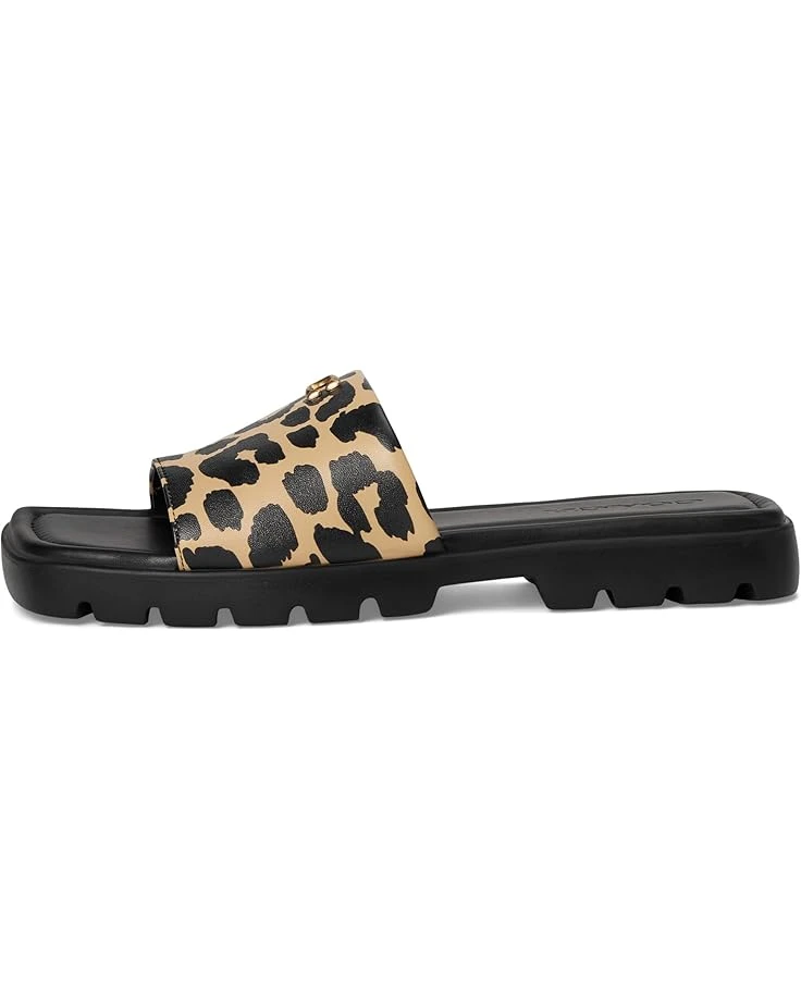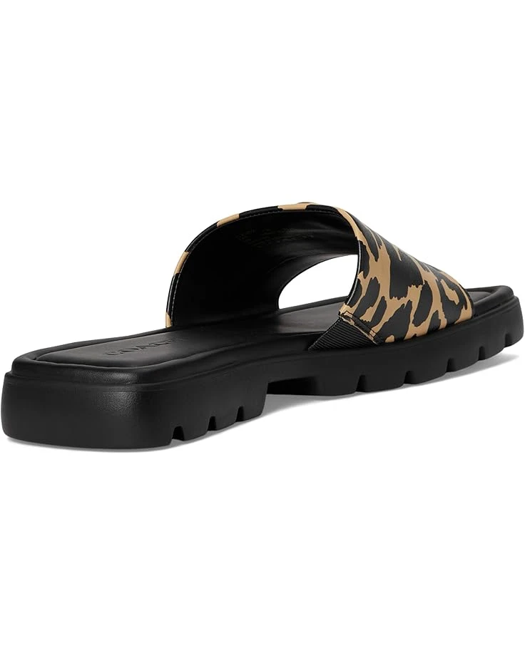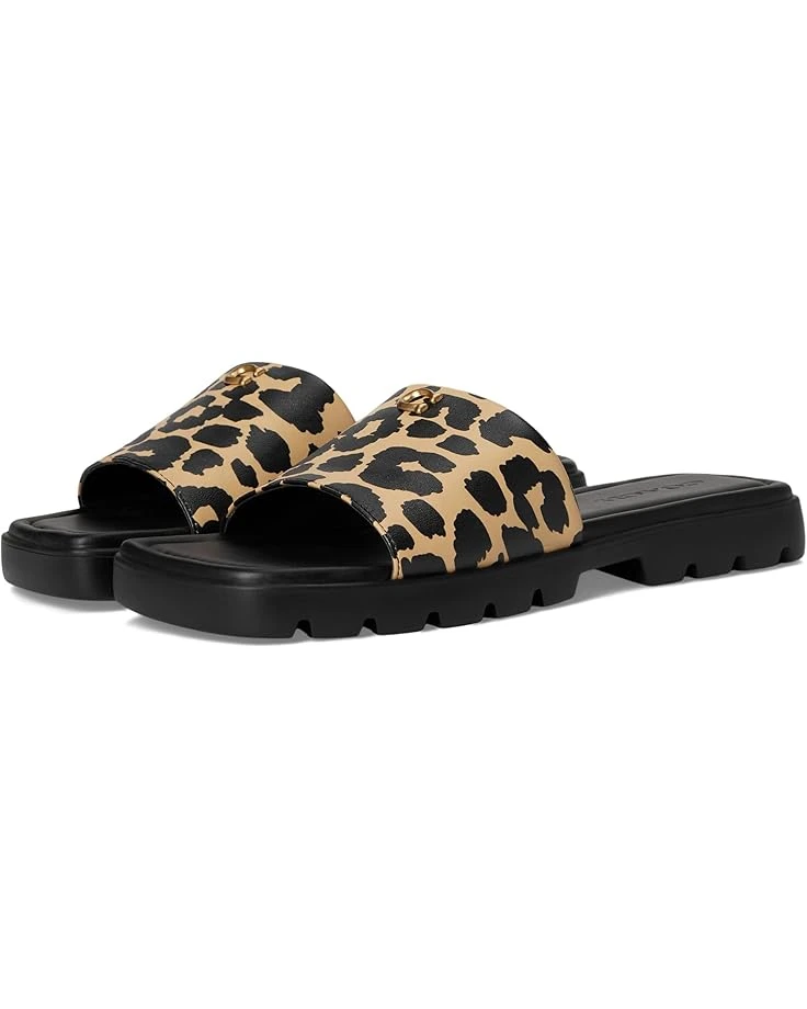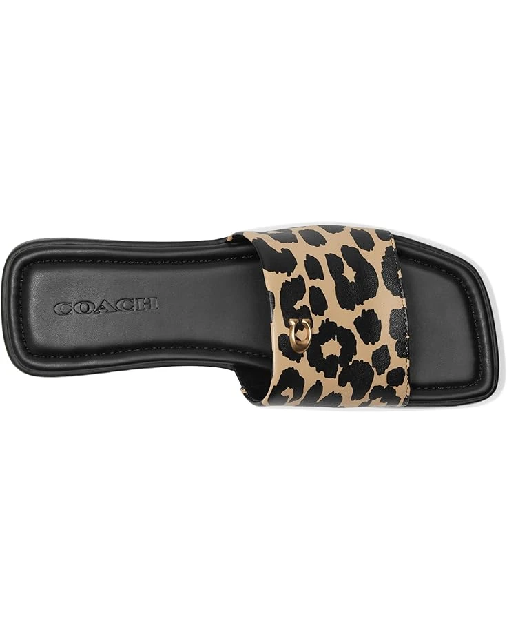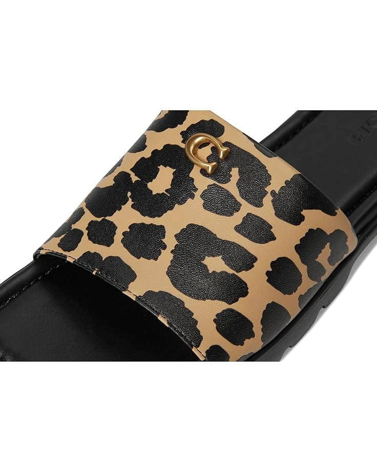 - Let your feet roar with confidence wearing COACH® Florence Sandal, featuring a bold leopard print on a sleek leather upper that exudes fierce sophistication. The faux leather lining and footbed pamper your feet with luxurious softness, while the lightweight EVA insole and outsole deliver cushioned support for all-day ease. Designed for effortless wear, this slip-on silhouette ensures you stride in style and comfort, whether you’re lounging poolside or exploring city streets.