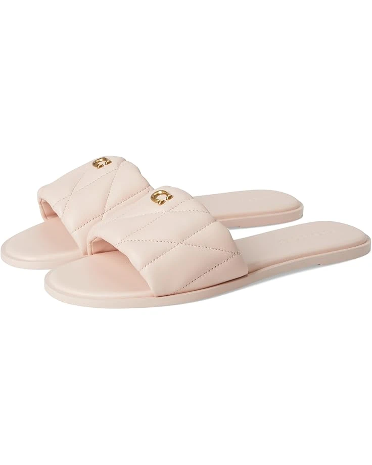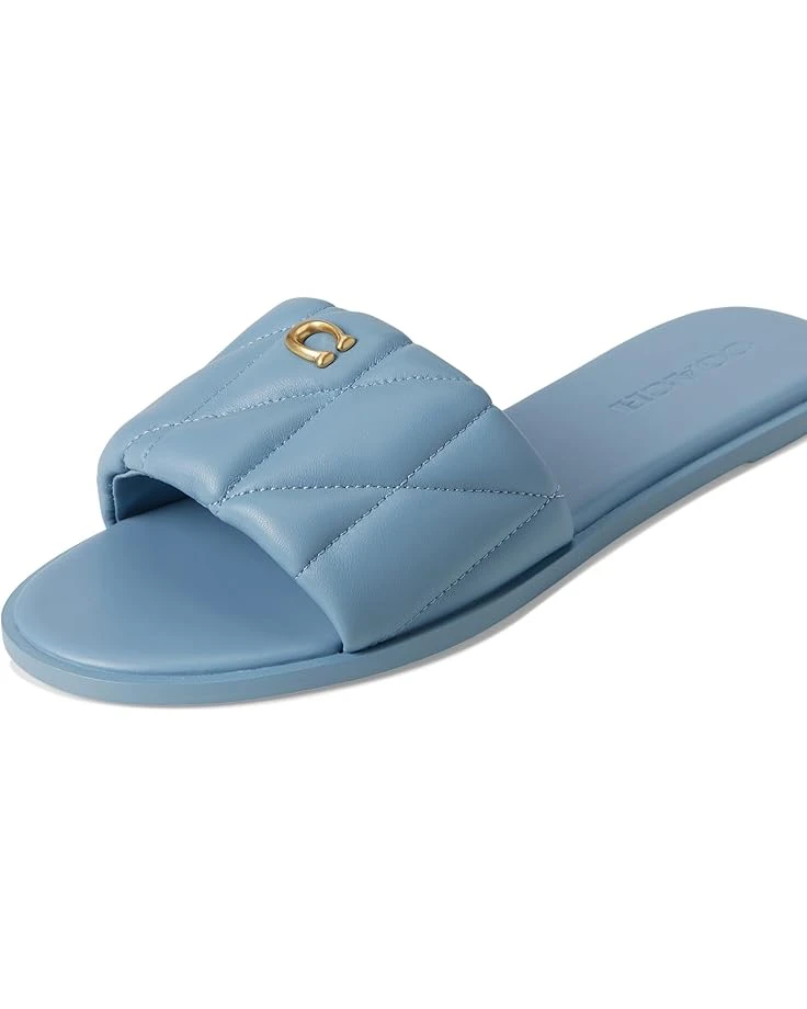 - Enjoy the barefoot freedom wearing the COACH® Holly Sandals with Quilting. Crafted from leather upper, man-made leather lining, and rubber insole, this pair of sandals features open round toe, low heel, quilted wide strap on the vamp with gold-tone logo emblem, slip-on style, and brand detailing on the footbed.