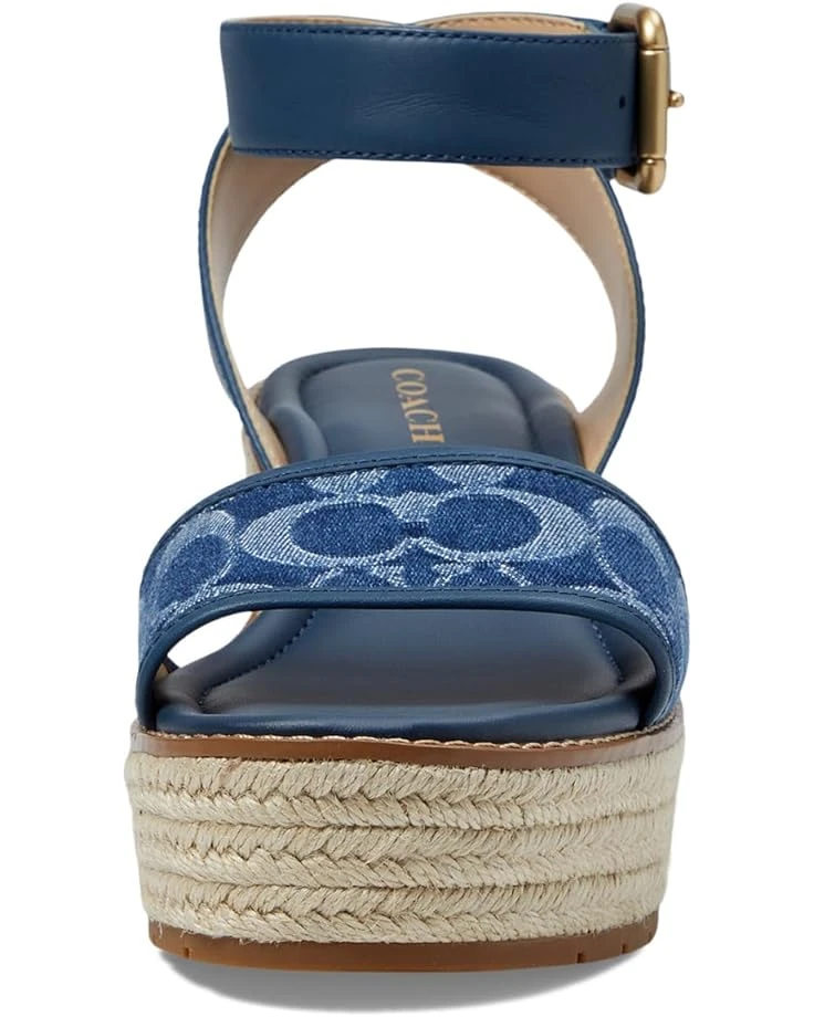 - Elevate your casual style in the COACH® Katherine Signature C Denim Espadrille. Featuring a round, open toe silhouette, signature monogram branding on strap, denim and leather upper, man-made leather lining and insole, and an adjustable buckle closure strap.