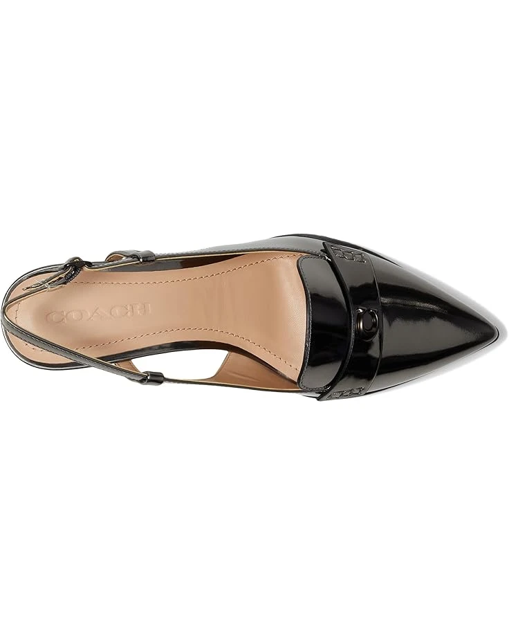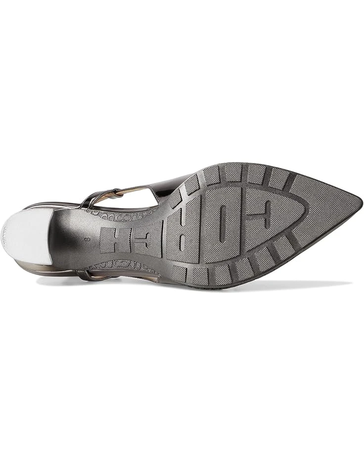 - Chic and sleek! The COACH® Nikola Metallic Leather Hybrid Slingback features a smooth metallic leather upper in a pointed toe silhouette with an adjustable slingback buckle closure and a sculptural heel.