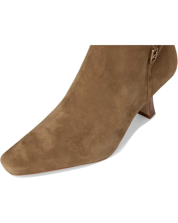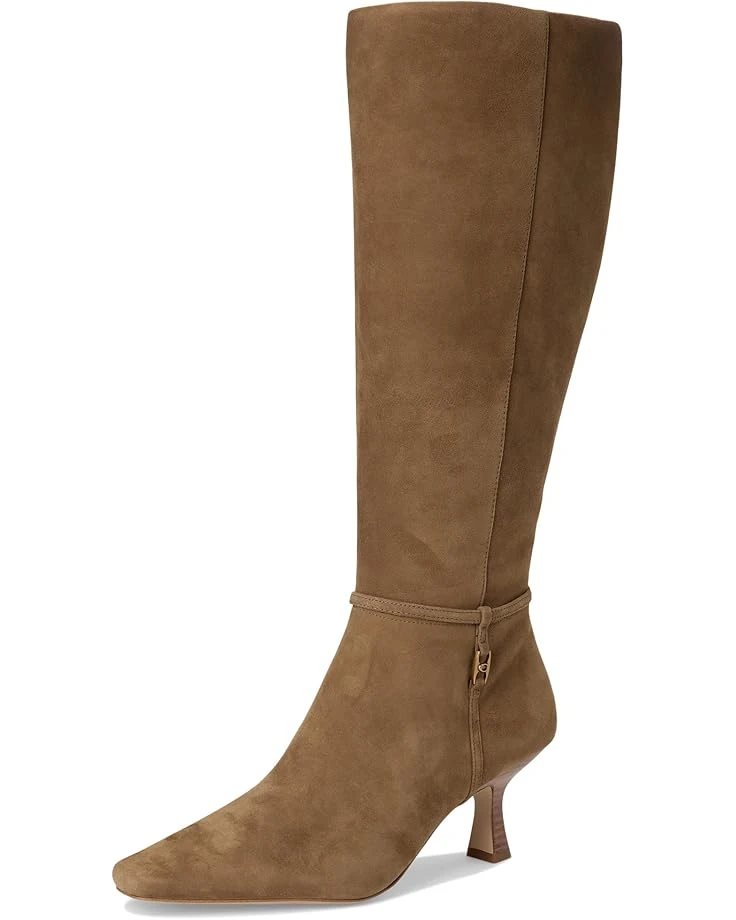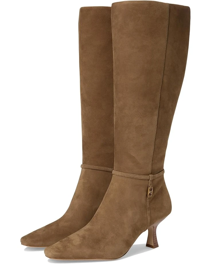 - From the desk to dinner, maintain your effortless style in the COACH® Raquel Suede Boots II. Featuring a side zipper closure in a square toe silhouette with a kitten heel, these boots are crafted from a smooth leather upper, leather and textile lining and a leather insole.