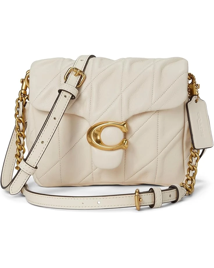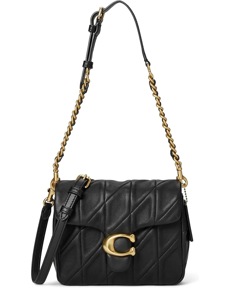 - Organize in style. The COACH™ Times Square Tabby Shoulder Bag 17: Versatile design, premium materials. Crafted from luxurious nappa leather with a soft cotton lining, this bag is the epitome of modern elegance. Its quilted design adds a touch of glamor, while the detachable short strap ensures versatility. With three spacious compartments and three handy pockets, organization is effortless. Secure your essentials with the snap closure, and keep smaller items within easy reach in the outside snap pocket.